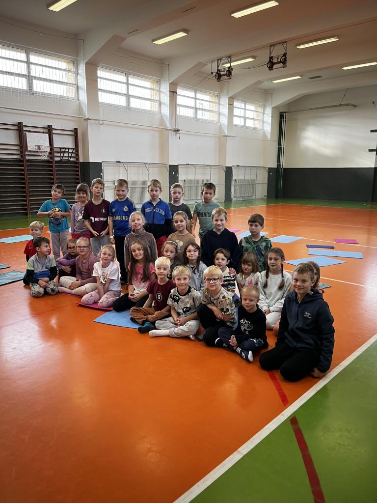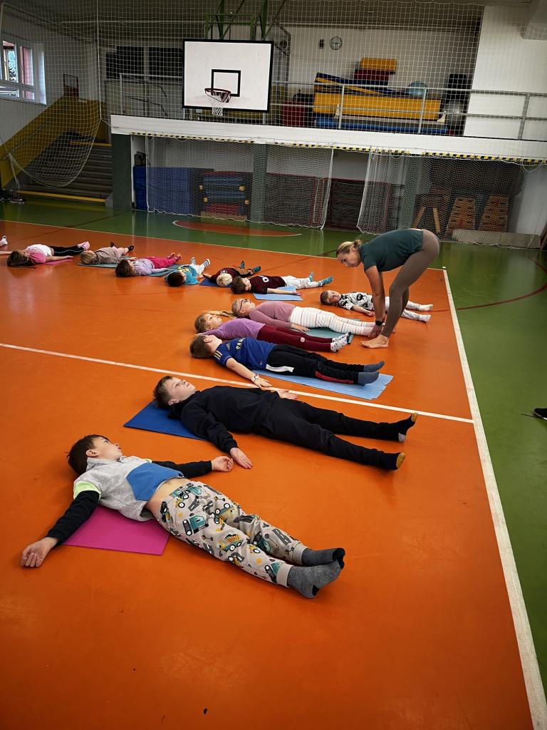 Děti se během cvičení seznámily se základy jógy a naučily se několik jednoduchých jógových pozic. Společně si vyzkoušely Pozdrav slunci, který jim pomohl protáhnout celé tělo a zlepšit soustředění. Součástí lekce byla také dechová cvičení – děti foukaly do peříčka, míčku a brčka, aby si uvědomily správné dýchání. Paní lektorka vedla hodinu hravou formou, která děti bavila a podporovala jejich klid a pozornost. Cvičení doprovázela uklidňující hudba, která navodila příjemnou atmosféru. Na závěr si děti odpočinuly v relaxační pozici a odcházely z hodiny uvolněné a spokojené.