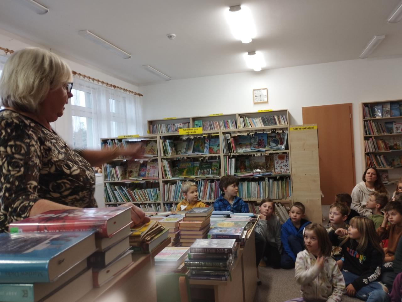 Paní Lukašíková nás provedla knihovnou a ukázala dětem možnosti, jak si mohou knížku či časopis vypůjčit. Den předem jsme si připomněli Mezinárodní den poezie ve družině čtením, recitací a vymýšlením básniček. Prozkoumali jsme život básníka a prozaika K. H. Máchy. Čtením jeho nejznámějšího díla Máj jsme zjistili, co znamená rým, i to, že zanechal svou stopu v nedalekém Zvěřinci, a tím je pro náš kraj ještě zajímavější.
